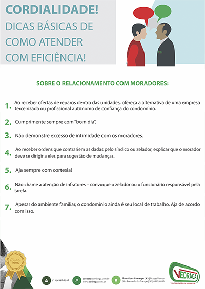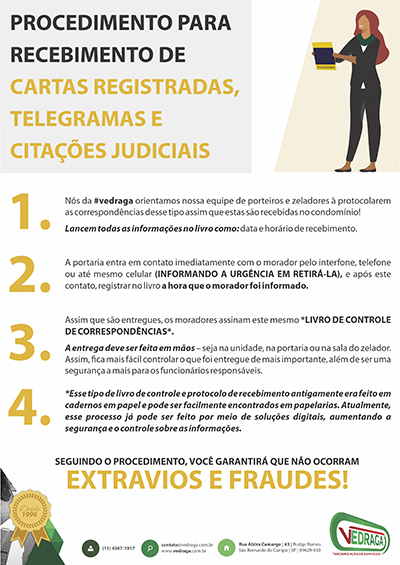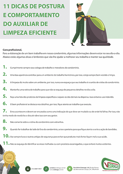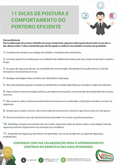 Nossos materiais educativos — como e-books, guias práticos e checklists — são elaborados com base na experiência da Vedraga e nas boas práticas do mercado, abordando temas como segurança, gestão condominial, limpeza profissional, atendimento na recepção e muito mais.